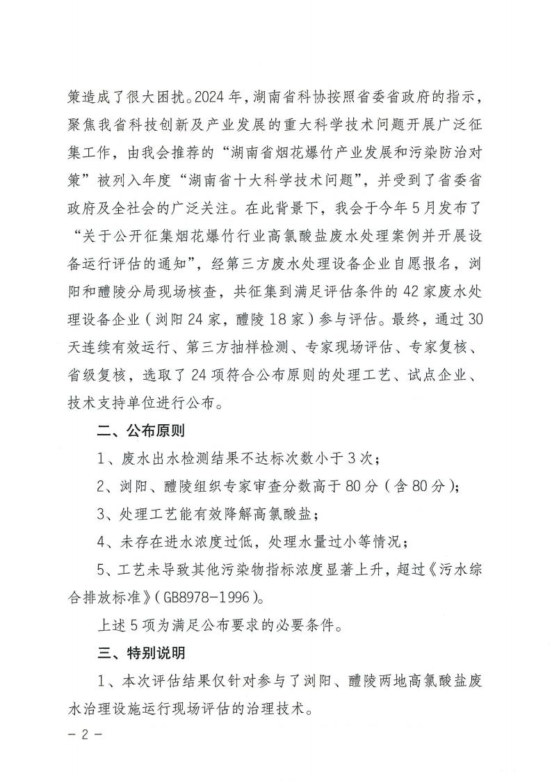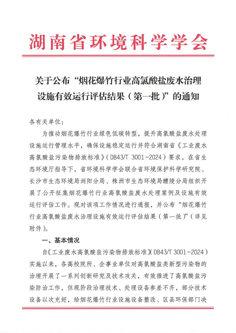 来源:湖南省环境科学学会,浏阳环保志愿者协会 湖南省生态环境厅与省市场监督管理局共同颁布了《工业废水高氯酸盐污染物排放标准》(DB43/ 3001—2024),这一标准自2024年10月1日起正式实施,成为全国首个针对高氯酸盐污染物的地方性排放规范。这引发了人们的广泛关注,究竟什么是高氯酸盐,它有何危害,为何湖南要针对这一污染物制定专门的排放标准? 2025 年 9 月 8 日,湖南省环境科学学会正式公布 “烟花爆竹行业高氯酸盐废水治理设施有效运行评估结果(第一批)”。此次评估在省生态环境厅指导下,由省环境科学学会联合省环境保护科学研究院、长沙市生态环境局浏阳分局、株洲市生态环境局醴陵分局共同开展,最终筛选出 24 项符合标准的废水处理工艺及配套试点企业、技术支持单位,为烟花爆竹行业绿色转型及环保部门决策提供关键参考。